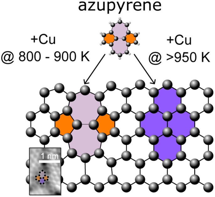 Chemical vapour deposition enables large-domain growth of ideal graphene, yet many applications of graphene require the controlled inclusion of specific defects. We present a one-step chemical vapour deposition procedure aimed at retaining the precursor topology when incorporated into the grown carbonaceous film. When azupyrene, the molecular analogue of the Stone–Wales defect in graphene, is used as a precursor, carbonaceous monolayers with a range of morphologies are produced as a function of the copper substrate growth temperature. The higher the substrate temperature during deposition, the closer the resulting monolayer is to ideal graphene. Analysis, with a set of complementary materials characterisation techniques, reveals morphological changes closely correlated with changes in the atomic adsorption heights, network topology, and concentration of 5-/7-membered carbon rings. The engineered defective carbon monolayers can be transferred to different substrates, potentially enabling applications in nanoelectronics, sensorics, and catalysis. The full paper is available here