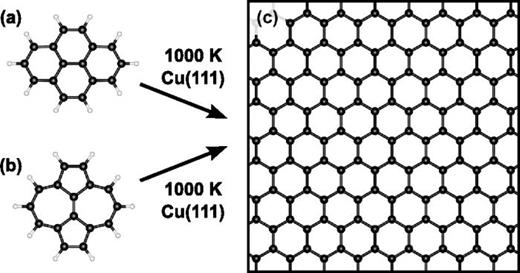 Ultra-high vacuum deposition of the polycyclic aromatic hydrocarbons azupyrene and pyrene onto a Cu(111) surface held at a temperature of 1000 K is herein shown to result in the formation of graphene. The presence of graphene was proven using scanning tunneling microscopy, x-ray photoelectron spectroscopy, angle-resolved photoemission spectroscopy, Raman spectroscopy, and low energy electron diffraction. The precursors, azupyrene and pyrene, are comparatively large aromatic molecules in contrast to more commonly employed precursors like methane or ethylene. While the formation of the hexagonal graphene lattice could naively be expected when pyrene is used as a precursor, the situation is more complex for azupyrene. In this case, the non-alternant topology of azupyrene with only 5- and 7-membered rings must be altered to form the observed hexagonal graphene lattice. Such a rearrangement, converting a non-alternant topology into an alternant one, is in line with previous reports describing similar topological alterations, including the isomerizWation of molecular azupyrene to pyrene. The thermal synthesis route to graphene, presented here, is achievable at comparatively low temperatures and under ultra-high vacuum conditions, which may enable further investigations of the growth process in a strictly controlled and clean environment that is not accessible with traditional precursors.