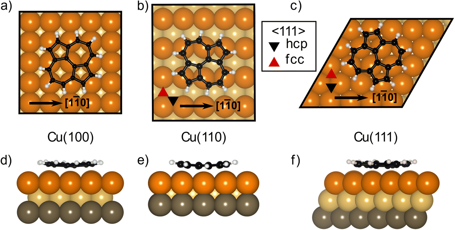The role of the inorganic substrate termination, within the organic–inorganic interface, has been well studied for systems that contain strong localised bonding. However, how varying the substrate termination affects coordination to delocalised electronic states, like that found in aromatic molecules, is an open question. Azupyrene, a non-alternant polycyclic aromatic hydrocarbon, is known to bind strongly to metal surfaces through its delocalised π orbitals, thus yielding an ideal probe into delocalised surface-adsorbate interactions. Normal incidence X-ray standing wave (NIXSW) measurements and density functional theory calculations are reported for the adsorption of azupyrene on the (111), (110) and (100) surface facets of copper to investigate the dependence of the adsorption structure on the substrate termination. Structural models based on hybrid density functional theory calculations with non-local many-body dispersion yield excellent agreement with the experimental NIXSW results. No statistically significant difference in the azupyrene adsorption height was observed between the (111) and (100) surfaces. On the Cu(110) surface, the molecule was found to adsorb 0.06 ± 0.04 Å closer to the substrate than on the other surface facets. The most energetically favoured adsorption site on each surface, as determined by DFT, is subtly different, but in each case involved a configuration where the aromatic rings were centred above a hollow site, consistent with previous reports for the adsorption of small aromatic molecules on metal surfaces. The full paper is available here